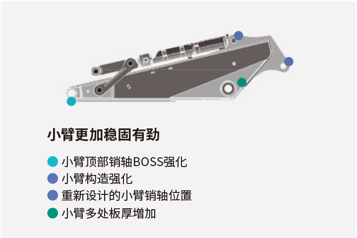 小臂頂部油缸銷軸直徑增加至110mm,讓小臂更加穩固有勁。